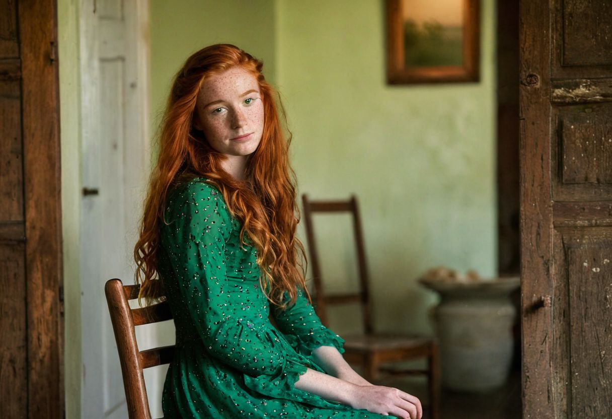 portrait photo, vivid color, DSLR, RAW, low camera angle, Leica 35mm, full body, sitting on old wooden chair, young irish girl, (pretty face), long red hair, freckles, (restless 1.2), (hand-made green narrow dress 1.2), fixing her hair with her hands, in the old house large hallway, old wooden table, vase with flowers, evening sunset light, (sharp:1.2), (detailed:1.2), (HD:1.2), (HDR:1.2), (8K:1.2), (best quality:1.2), (best resolution:1.2), maximalist, (masterpiece:1.2) dramatic light, lateral light