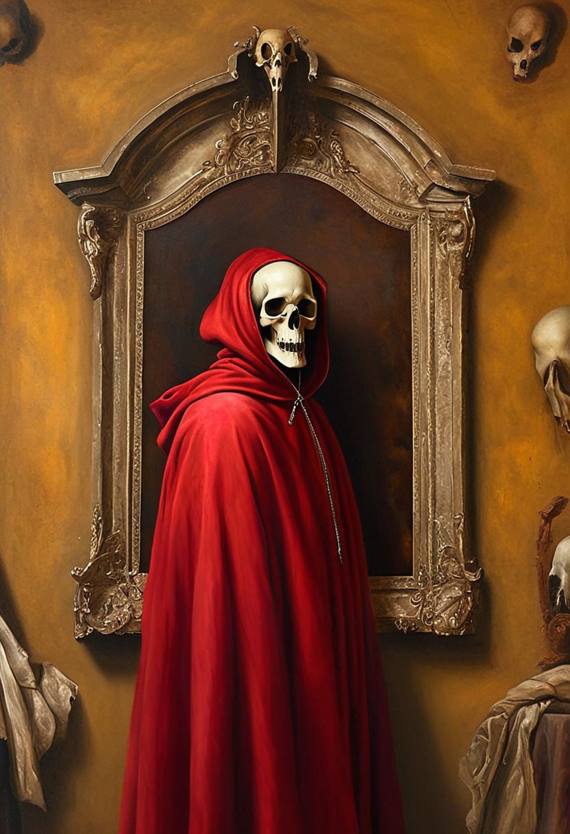 A renaissance painting of the grim Reaper wearing an all red hooded cape, his face is obscured by a bone skull mask, he stands in front of a classical baroque style wall with hanging paintings, the background color should be dark maroon and gold, painted in oil in a hyper realistic style. analog style ,epiCPhotoGasm-colorfulPhoto