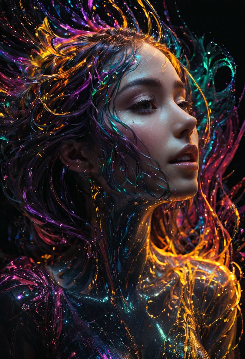 colorful, ColorART, Movie Still, Film Still, Cinematic, Cinematic Shot, Cinematic Lighting, JuggernautNegative, This stunning image depicts a female figure surrounded by vibrant, swirling strands of light in various colors. The strands seem to emanate from and envelop the subject, creating a mesmerizing and abstract effect. The colors range from warm tones like red, orange, and yellow to cooler hues like blue, green, and purple, creating a visually striking contrast. The strands appear to have a luminous, neon-like quality, giving the image a futuristic and otherworldly vibe. The female figure is portrayed in a side profile view, her face partially obscured by the swirling strands. Her facial features are visible, but the emphasis is on the interplay between her form and the dynamic, colorful strands that surround and intertwine with her. The background is a deep, solid black, allowing the vibrant colors and intricate patterns of the light strands to take center stage. The overall composition creates a sense of motion, energy, and a dreamlike quality, inviting the viewer to interpret the image's symbolism and meaning. This image could be seen as a representation of the complexities of human emotion, thought, or creativity, with the figure serving as a vessel for the ever-changing and interconnected streams of energy that shape our experiences. .