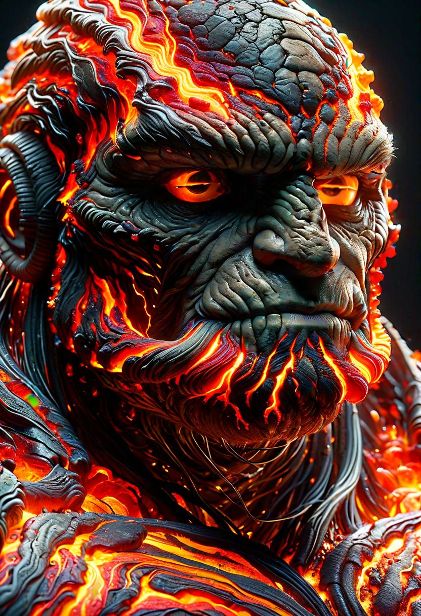 close up face of [Benjamin Jacob "Ben" Grimm, also known as the Thing] made of ral-lava, macro photography, (enchanting:1.3), (luminous:1.2), (oversized flora:1.1), mystical, vibrant photography, shimmering light, dreamy, whimsical, serene, soft-focus, hyper-detailed digital art, ral-lava