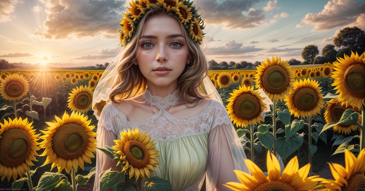Impressionist photo of a blooming field of sunflowers, capturing their vibrant yellow petals and delicate green stems, with a gentle breeze swaying the flowers, by a natural arch formed by overhanging trees, against the backdrop of a golden sunset, diffused by soft clouds, captured from a low-angle perspective with a vintage film camera, <lora:add_detail:1>