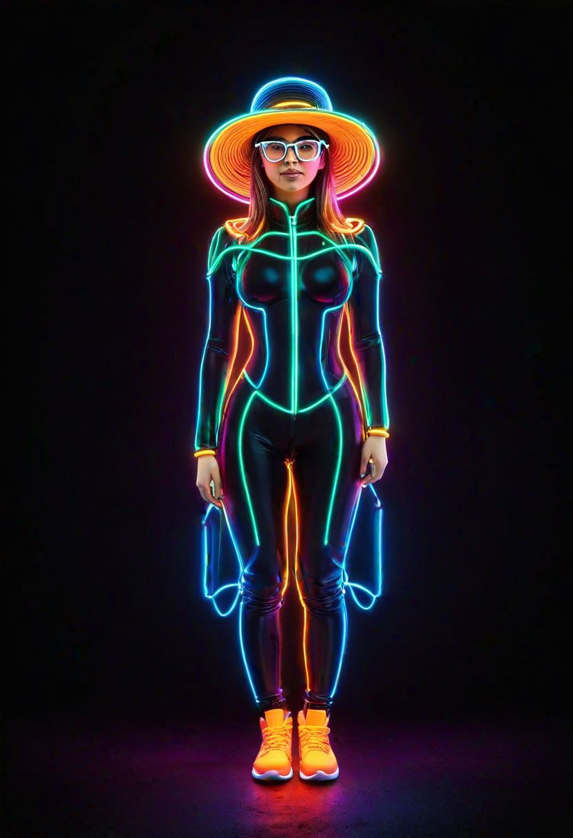 volumetric lighting, symmetry BREAK 1girl, glasses, hat, full body, ((neon)), lineart, black background