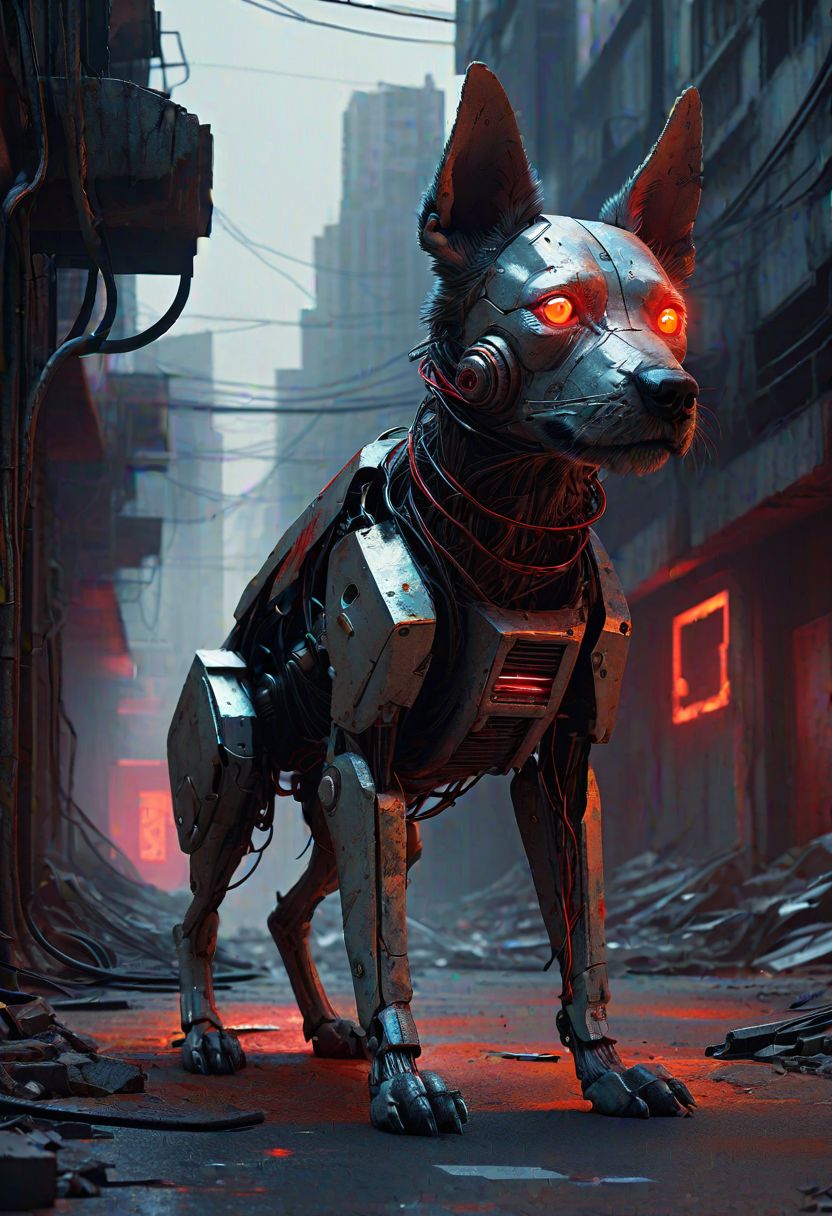 In the ruins of a cyberpunk city, a sleek, metallic canine with glowing red eyes prowls the empty streets, its fur a patchwork of corroded steel and neon wiring. This post-apocalyptic noir-inspired digital pet is depicted in a hyper-realistic digital painting, rendered with exquisite detail and depth. The intricate textures and lighting effects bring out the pet's mechanical intricacies and eerie, almost lifelike expression. The overall image exudes a sense of looming danger and futuristic decay, making it a striking and immersive piece of digital art.