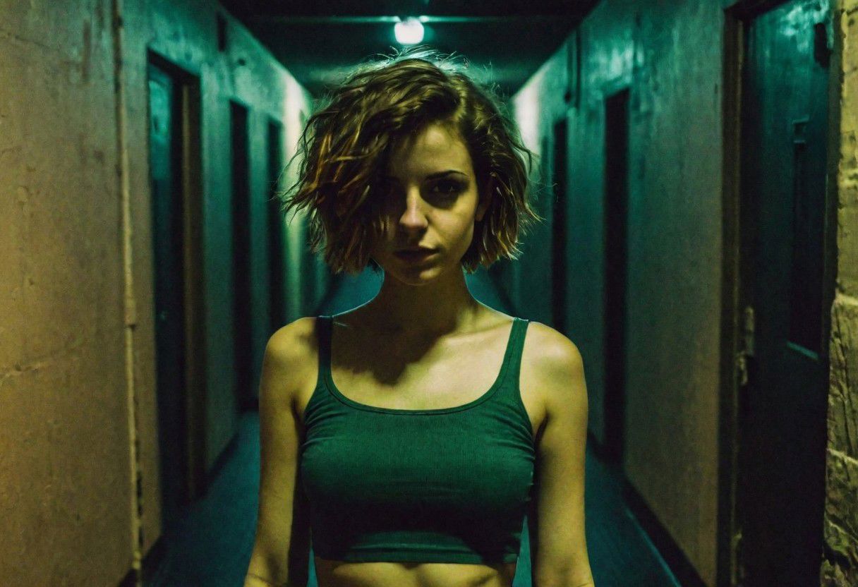 young woman, skimpy revealing crop top, posing reluctantly in an empty night club corridor, raw, unedited, amateur phone photo, grainy, (cinematic shot), cinematic lighting, webcam quality, frizzy messy short hair, flat color, upper body shot, (low contrast), upper body portrait shot, analog lo-fi film portrait photo, cinematic grain filter, detailed pretty face, accidental art, flat color