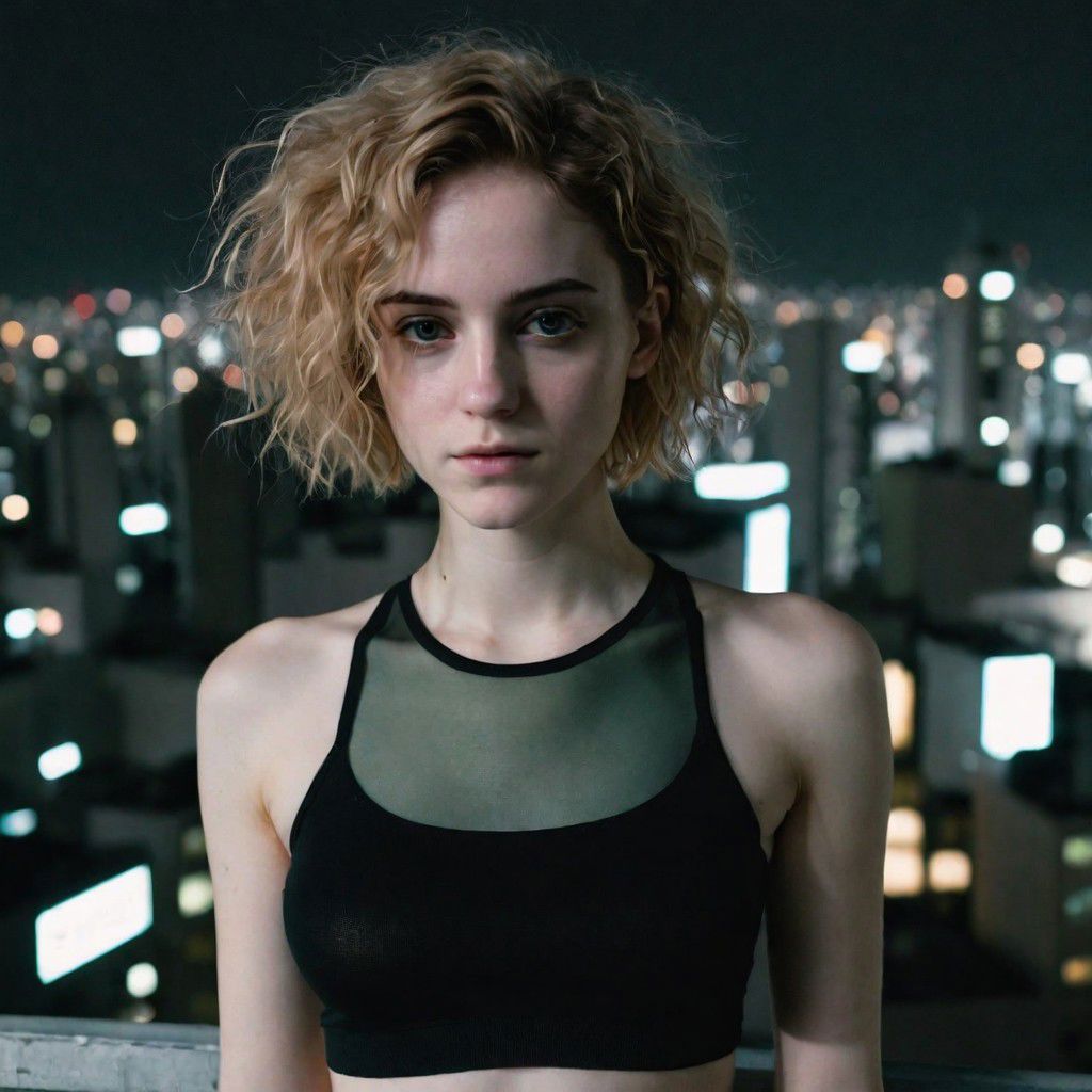 cyborg young woman, dark cyberpunk, highly detailed face, pale fragile delicate body, frizzy bob cut hair, (stylish haircut:0.9), wearing a tight stylish minimalistic black see-through transparent crop top, visible nipples, subtle cyberware, standing on a cyberpunk Japanese city rooftop at night, scenic view, cinematic scene, cinematic lighting, analog-style photo, grainy amateur lo-fi portrait photo, desaturated colors, (low contrast), distracted, b-cup breasts, eyeliner, (eyeshadow:1.1), shy, blushing, raw photo, phone photo, 3/4, (upper body portrait shot), medium shot, accidental art, candid, crisp image, high detail, (eyebags:0.8), (chromatic aberration)