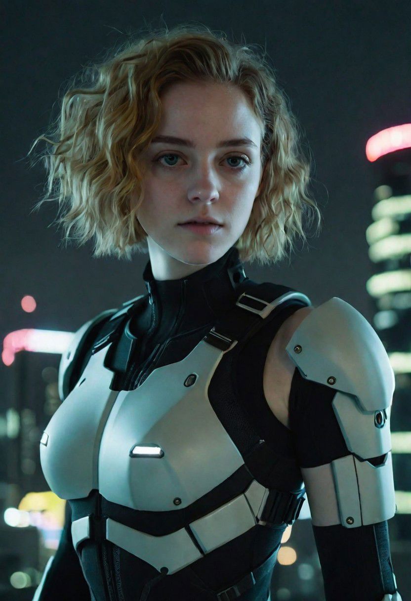 cyborg young woman, dark cyberpunk, highly detailed face, pale fragile delicate body, frizzy bob cut hair, (stylish haircut:0.9), posing in a tight stylish minimalistic futuristic open black hi-tech tactical techwear lignerie with a few symmetrical cutouts, subtle cyberware, standing on a cyberpunk Japanese city rooftop at night, scenic view, cinematic scene, cinematic lighting, analog-style photo, grainy amateur lo-fi portrait photo, desaturated colors, (low contrast), distracted, b-cup breasts, eyeliner, (eyeshadow:1.1), shy, blushing, raw photo, phone photo, 3/4, (upper body portrait shot), medium shot, accidental art, candid, crisp image, high detail, (eyebags:0.8), (chromatic aberration)