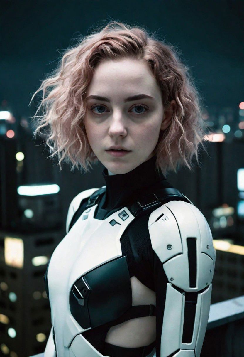 cyborg young woman, dark cyberpunk, highly detailed face, pale fragile delicate body, frizzy bob cut hair, (stylish haircut:0.9), posing in a tight stylish minimalistic futuristic open black hi-tech techwear lignerie with a few symmetrical cutouts, subtle cyberware, standing on a cyberpunk Japanese city rooftop at night, scenic view, cinematic scene, cinematic lighting, analog-style photo, grainy amateur lo-fi portrait photo, desaturated colors, (low contrast), distracted, b-cup breasts, eyeliner, (eyeshadow:1.1), shy, blushing, raw photo, phone photo, 3/4, (upper body portrait shot), medium shot, accidental art, candid, crisp image, high detail, (eyebags:0.8), (chromatic aberration)