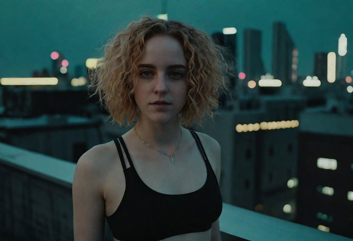 cyborg young woman, dark cyberpunk, highly detailed face, pale fragile delicate body, frizzy bob cut hair, (stylish haircut:0.9), wearing an open black hi-tech tactical techwear crop top, subtle cyberware, standing on a cyberpunk night city rooftop, scenic view, cinematic scene, cinematic lighting, analog-style photo, grainy amateur lo-fi portrait photo, desaturated colors, (low contrast), distracted, b-cup breasts, eyeliner, (eyeshadow:1.1), shy, blushing, raw photo, phone photo, 3/4, (upper body portrait shot), medium shot, accidental art, candid, crisp image, high detail, (eyebags:0.7)