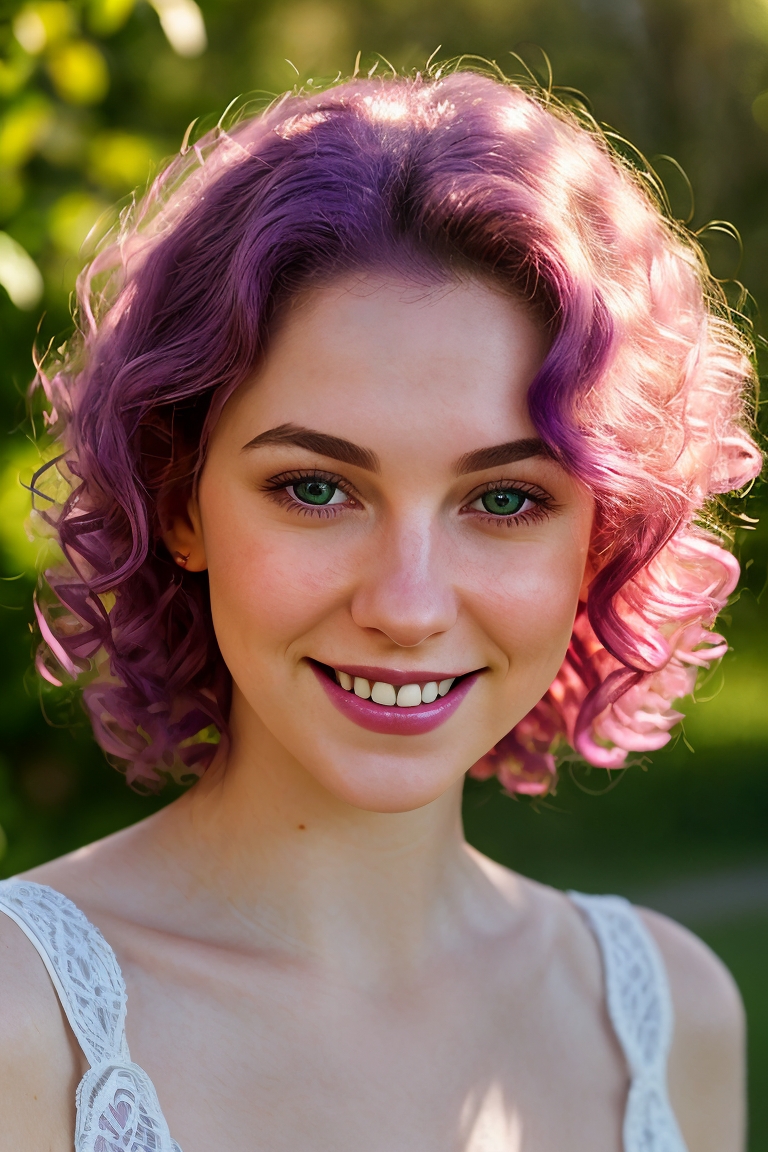 <lora:SensualMind-Cabaret-Athena-v1:0.6> a close up of a pale woman with a fun smile, face blush, purple curly hair and green eyes BREAK italian shot, lens flare, spot lights, soft focus, intrincate details, photo realistic