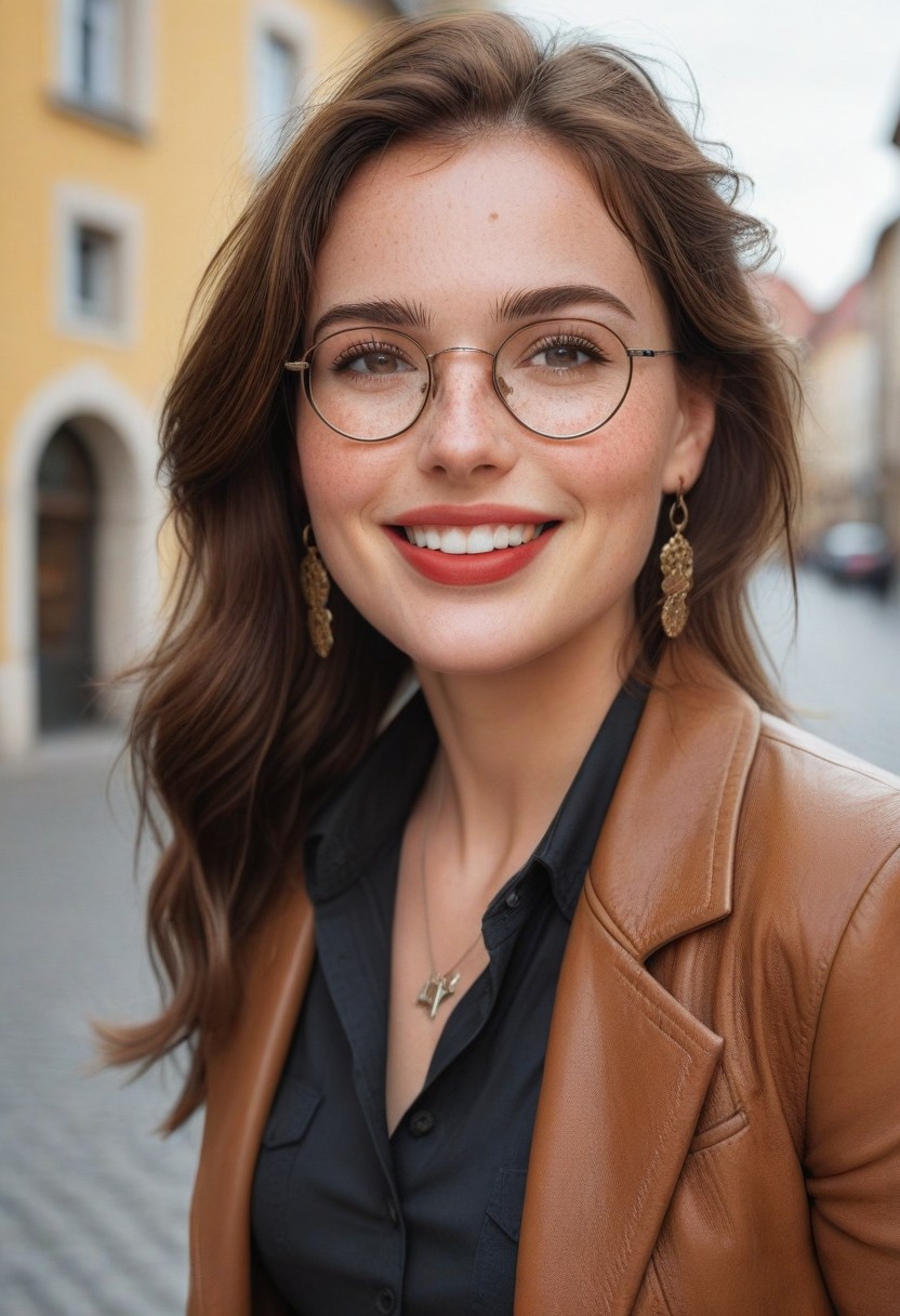 masterpiece, hyperrealistic, epicRealism, UHD, 8k, photography, cowboy shot, makeup, beautiful, beautiful eyes, long eyelashes, freckles, detailed mouth and eyes, white teeth, perfect teeth, detailed lips, red lipstick, detailed face, perfect and delicate hands, gorgeous woman, cute face, petite, smile, big smile, white teeth, dark eyeliner, beautiful woman, freckles, Expressiveh, 1girl, gorgeous 40 years old woman,( cute woman, cute face, mature), focus on girl, dynamic lighting, cinematic take, cinematic lighting, award-winning photo, skin texture, vivid natural colors, full ultra HD 8k quality, masterpiece, best quality, highly detailed, overall detail), skin details,realistic skin, medium breasts, round natural breasts, fit, brunette wavy hair, vivid brown eyes, large round glasses, front view, in a German old town, daytime, wearing a black leather jacket, yellow blouse, crucifix pendant in a long leather cord dangling between breasts, small golden earrings, brown trousers and knee-high black boots, natural sunlight, daytime, (shallow depth of field, boken, warm light). volumetric lighting, vivid colours,