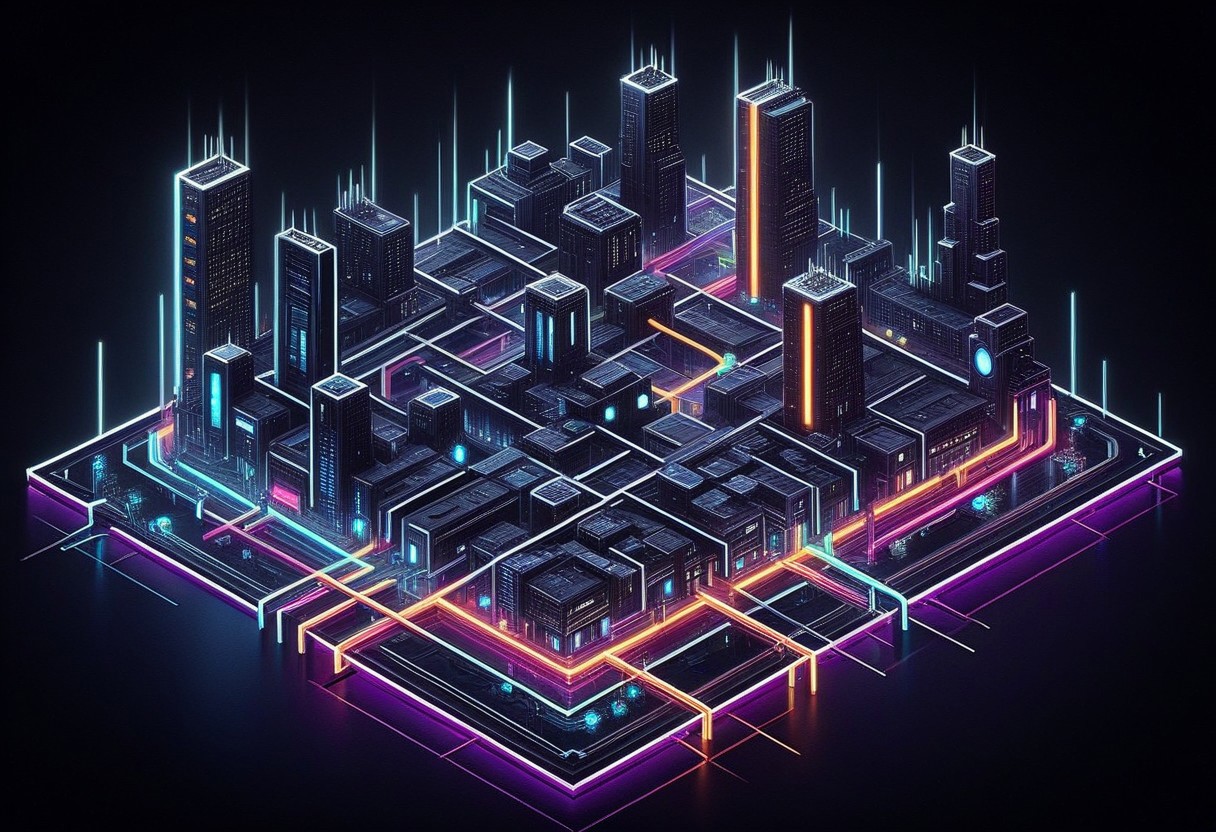 qu4ntum, Tiny cityscape, Isometric_Setting, intricate network of streets, noir, neon-lit buildings, glowing pathways, sci-fi futuristic design, micro-sized structures, interconnected elements, quantum-inspired layout, vibrant colors, detailed architecture, urban atmosphere, advanced technology, abstract shapes, seamless connections, dynamic energy flow, mad-neon-noir