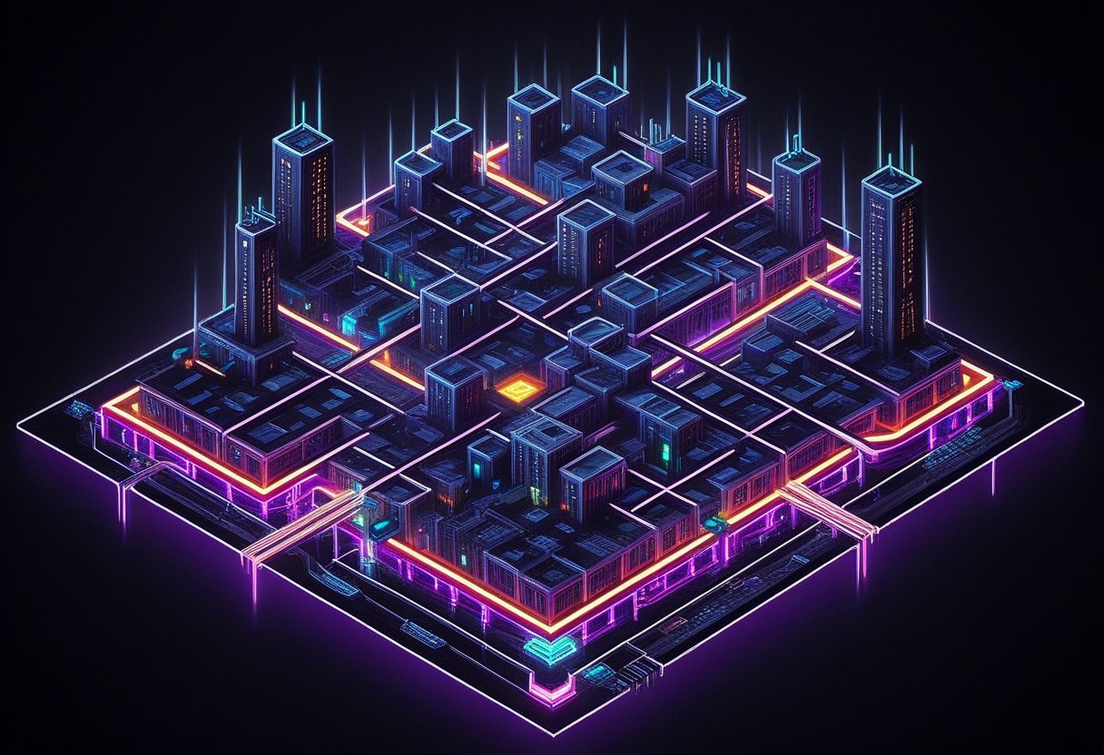 qu4ntum, Tiny cityscape, Isometric_Setting, intricate network of streets, noir, neon-lit buildings, glowing pathways, sci-fi futuristic design, micro-sized structures, interconnected elements, quantum-inspired layout, vibrant colors, detailed architecture, urban atmosphere, advanced technology, abstract shapes, seamless connections, dynamic energy flow, mad-neon-noir