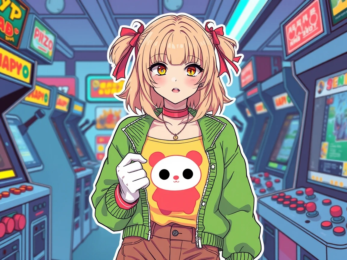 In the Art Style of "Wireframe Drawing", full color, thick lines, thickness, dashed lines style, she has blonde hair with whitish red at the tips, her hair is medium length, she has light red ribbons holding some of her hair up on either side of her head, the rest of her hair is layered and tapered, she wears a light red ribbon as a necklace, she has a green button zipper sweater, the sweater is open showing a yellow tank top with a light red cartoon panda design under it, she wears brown shorts, she has white gloves with very pale red stripes on them, the background is a video arcade from the 1980s,