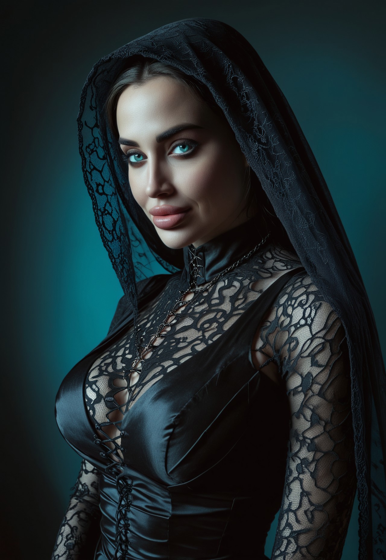 safe_pos, A tenebrous portrait of a solitary figure wearing an intricate and highly detailed black gothic dress. The subject emanates an aura of melancholic resignation. Rendered in a style that straddles the line between hyperrealism and ethereal artistry, the image evokes a sense of profound pathos. The background, a shadowy suggestion of weathered wood, should recede into obscurity, directing the viewer's gaze towards the subject's visage. A low-key lighting setup, reminiscent of chiaroscuro painting, will further accentuate the figure's isolation and despair. This will amplify the emotional resonance of the image, transforming it from a mere portrayal into a poignant exploration of captivity and resilience. Her eyes stare at the viewer and she adorns a mysterious smile, conveying a sexual tension. Symbolist chiaroscuro, tenebrist, volumetric lighting, subtle halation, high-contrast, film grain, teal and orange color grading, high dynamic range, S-curve gamma