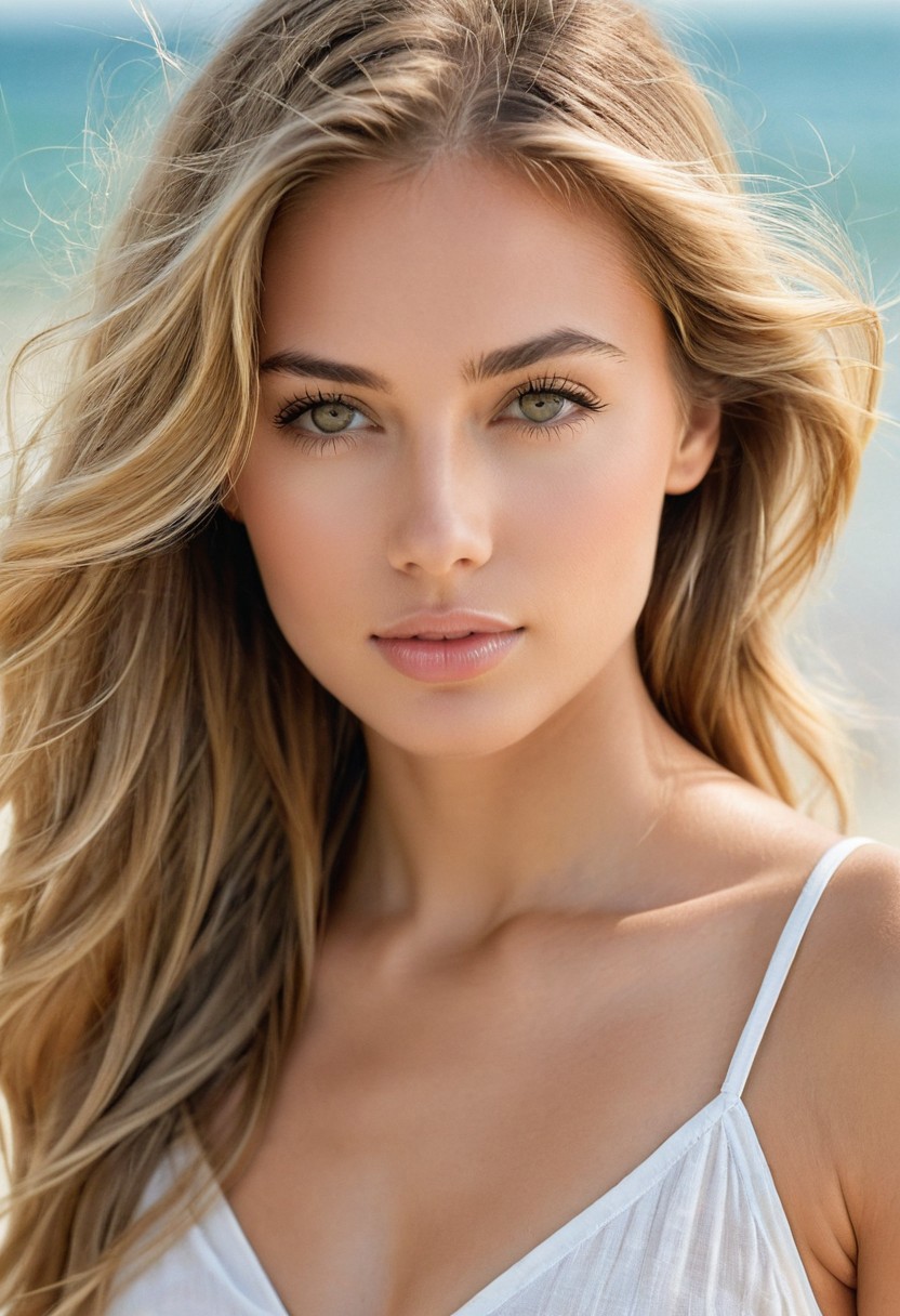 "Capture the essence of a 30-year-old woman with natural, warm-toned skin and long, straight blond hair. The scene should be set on a serene, golden beach at low tide, with the ocean waves gently lapping at the shore in the background. The model's face should be turned towards you, with a gentle, introspective expression. Her eyes should be bright green, almond-shaped, and framed by soft, natural lashes. Her skin tone should be warm to medium, with subtle golden undertones. Consider using a shallow depth of field to blur the background and emphasize her features." You could also add some specific details to make the image more compelling: A small, delicate shell or piece of driftwood on the beach that adds visual interest A few wispy strands of hair blowing in the ocean breeze A subtle, warm glow around the model's face to suggest a sense of relaxation and contentment