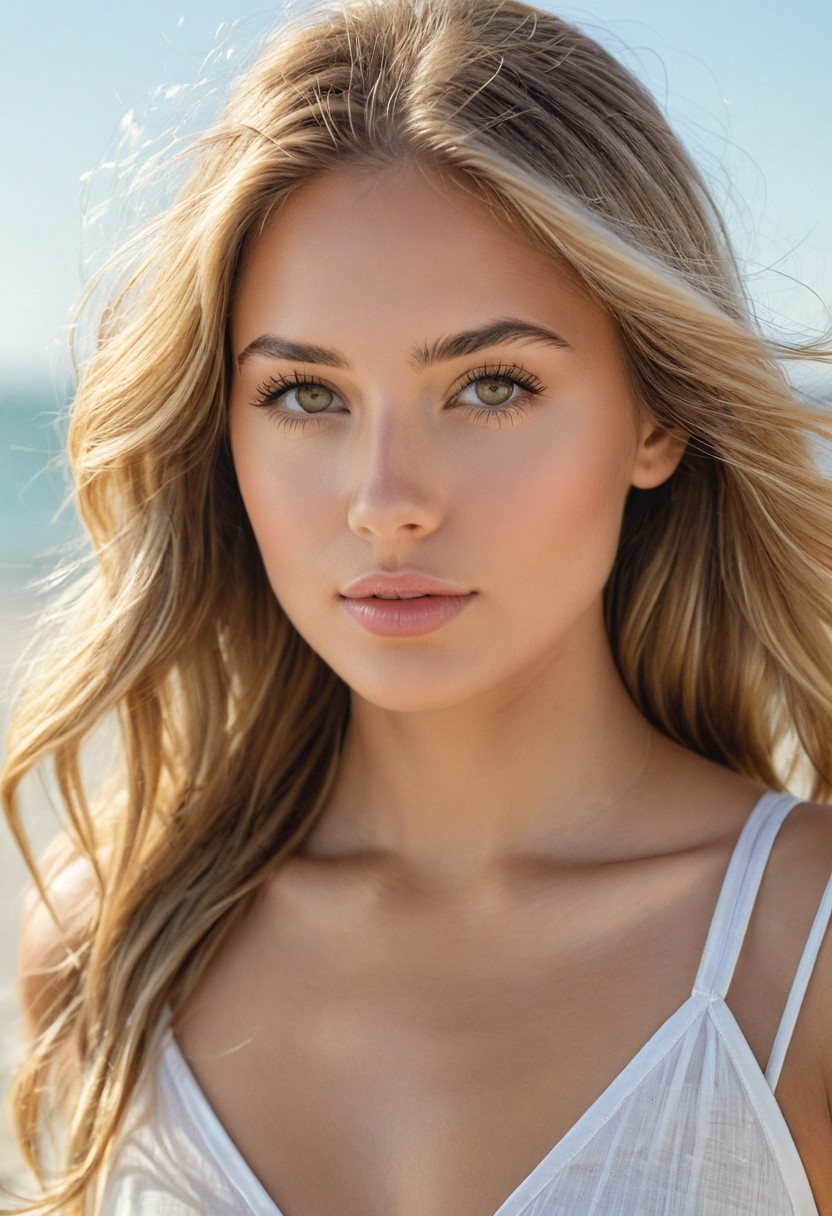 "Capture the essence of a 30-year-old woman with natural, warm-toned skin and long, straight blond hair. The scene should be set on a serene, golden beach at low tide, with the ocean waves gently lapping at the shore in the background. The model's face should be turned towards you, with a gentle, introspective expression. Her eyes should be bright green, almond-shaped, and framed by soft, natural lashes. Her skin tone should be warm to medium, with subtle golden undertones. Consider using a shallow depth of field to blur the background and emphasize her features." You could also add some specific details to make the image more compelling: A small, delicate shell or piece of driftwood on the beach that adds visual interest A few wispy strands of hair blowing in the ocean breeze A subtle, warm glow around the model's face to suggest a sense of relaxation and contentment