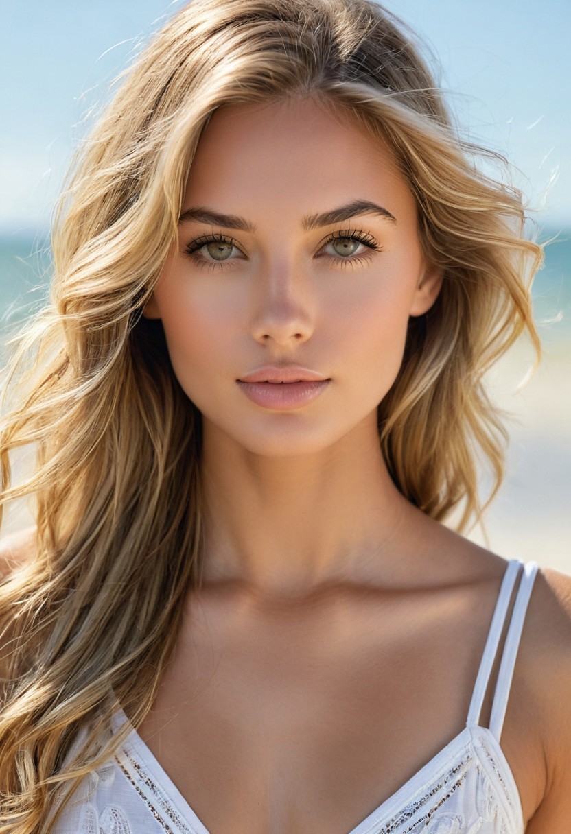 "Capture the essence of a 30-year-old woman with natural, warm-toned skin and long, straight blond hair. The scene should be set on a serene, golden beach at low tide, with the ocean waves gently lapping at the shore in the background. The model's face should be turned towards you, with a gentle, introspective expression. Her eyes should be bright green, almond-shaped, and framed by soft, natural lashes. Her skin tone should be warm to medium, with subtle golden undertones. Consider using a shallow depth of field to blur the background and emphasize her features." You could also add some specific details to make the image more compelling: A small, delicate shell or piece of driftwood on the beach that adds visual interest A few wispy strands of hair blowing in the ocean breeze A subtle, warm glow around the model's face to suggest a sense of relaxation and contentment