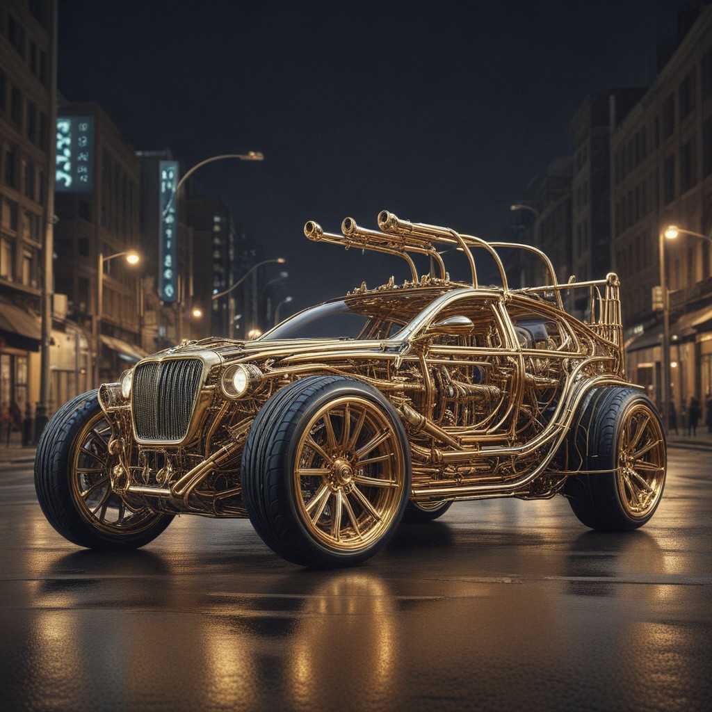 a raw photograph of a (qu4ntum style), a car made with (brass pipes) and (silver circuit wire), futuristic car, nigh city street background