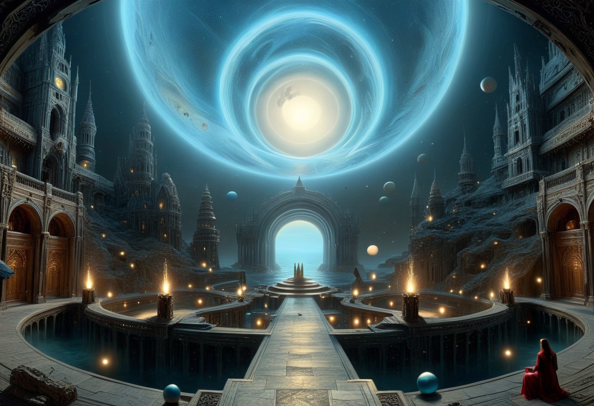 A surreal representation of a parallel universe. perspective, light and shadow, magnificent, epic, majestic, magical, concept art, digital artwork, illustrative, illustration, fantasy, dreamy, masterpiece, semi-realistic, UHD, 8k, depth of field, epic, majestic, magical, fantasy, dreamy, moody, enchanting, mystical, imaginative, otherworldly, dynamic, intricate details, highly detailed, ultra-detailed, hyper-detailed, absurdres, sharp focus, studio lighting, cinematic, midjourneyv6.1, qu4ntum, surreal_XL