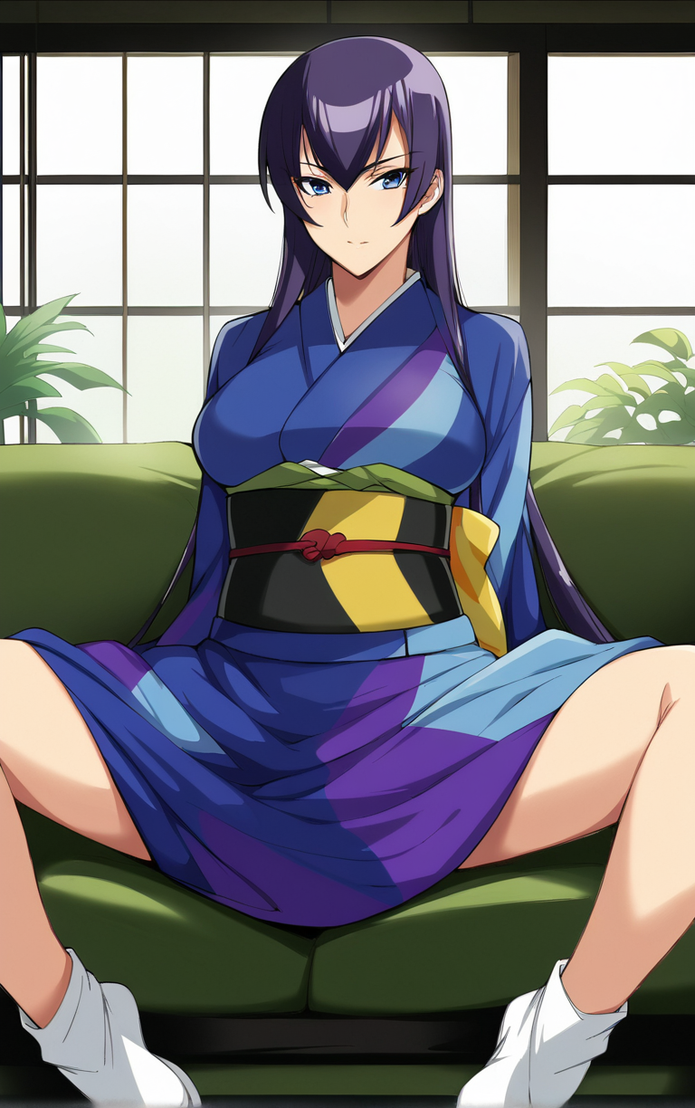 score_9, score_8_up, score_7_up, looking at viewer, BREAK Kimono_SaekoBusujima_ownwaifu, 1girl, blue eyes, hair between eyes, long hair, purple hair, very long hair, large breasts, bangs, sidelocks, japanese clothes, kimono, sash, obi, long sleeves, tabi, wide sleeves, (sitting, spread legs), arms behind back, couch, window shade, indoors, <lora:PONYXL_HighschoolOfTheDead_SaekoBusujima_ownwaifuV1:0.95> , depth of field, solo,