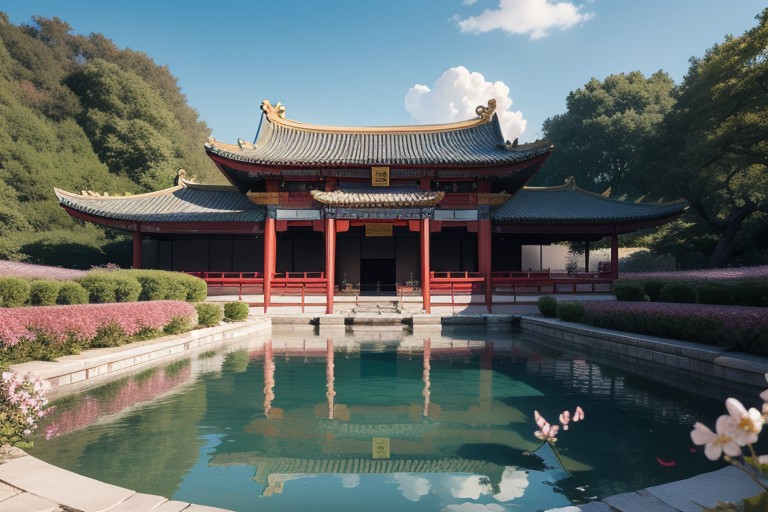 illustration, ancient chinese palaces,peacock fan,outdoors,day,blue sky,no humans,vase,pond,pillar,Plum blossom flowers,gongdeng,lamp,drum,multiple tables,cushion,round platform,stairs,luohan bed, perspective,masterpiece,best quality,,<lora:palaces-all-2-0000011:0.9>, masterpiece, best quality,