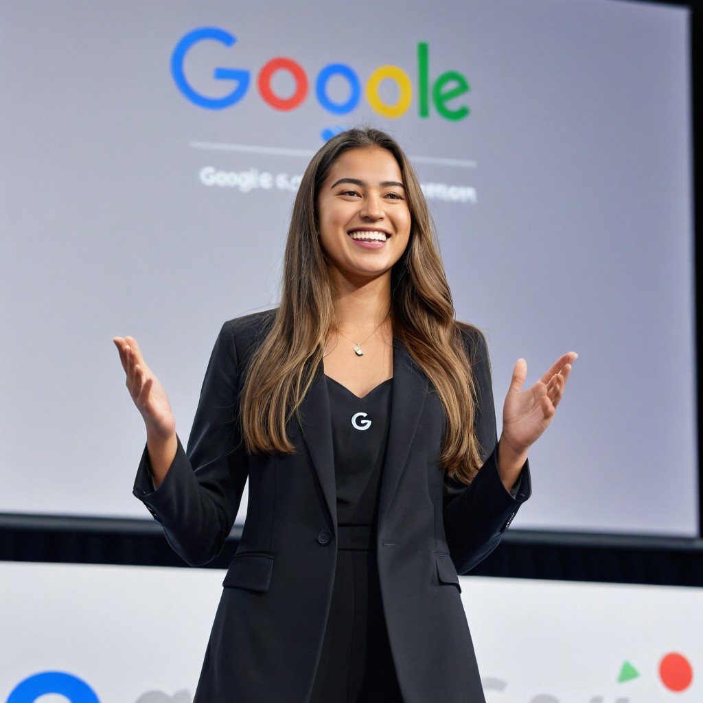 Full body shot of a young woman, 24 years old with long, flowing hair and a radiant smile confidently addressing the audience from center stage at a Google tech conference, dressed in formal black attire with a prominent Google ID card displayed on her chest. The background is softly blurred in pristine white, subtly showcasing the Google corporate logo. The image is photorealistic, exuding professionalism and capturing the essence of an engaging and dynamic speaker. Shot in ultra HD quality, every detail is crisp and lifelike, with a grainy texture from being shot by an analogue camera.