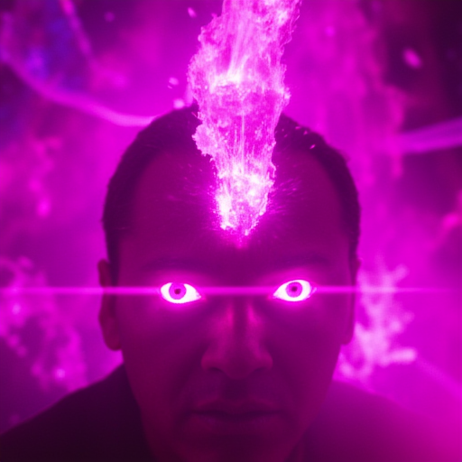 Imagine an image in the color out of space style of Lovecraftian psychedelic horror: A person’s eyes glow with an unnatural, electric pink luminescence, reflecting the madness of the void. A crystalline structure erupts from their forehead, pulsating with arcane energy. The background is awash in swirling magenta mists, as spectral figures shift in the periphery of vision.