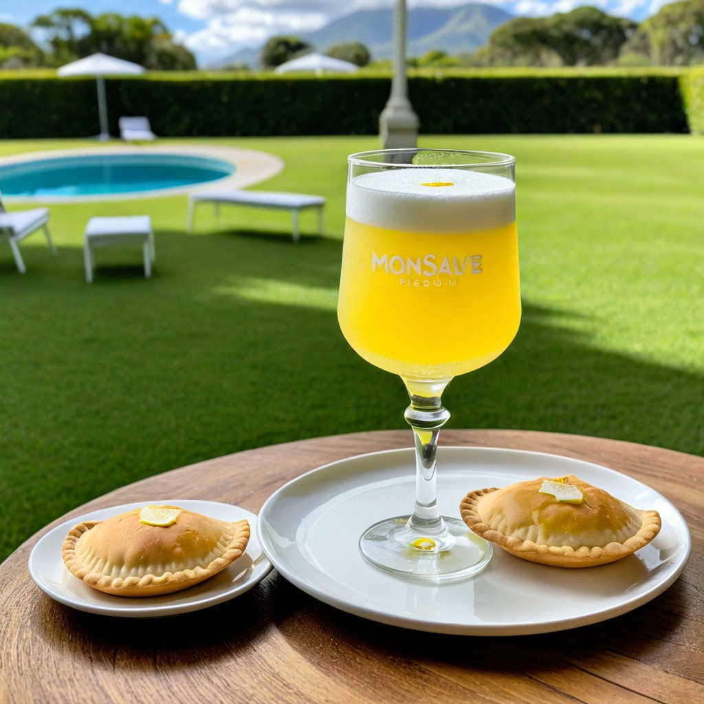 "A single 5oz Personalized Double Old Fashioned glass, wide at the top and very tapered at the base, containing a yellow Pisco Sour made with lemon. The drink is topped with a thin layer of white foam. The glass features translucent white text on its surface that reads 'Monsalve.' The glass is the only one on the table, accompanied by a dish of empanadas. The table is minimalistic, with no additional elements, set against a backdrop of a beautiful lawn with tables and canopies. No swimming pool visible, only grass in the background."