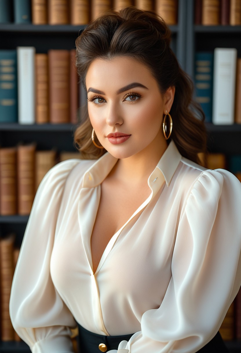 professionally taken portrait of an attractive 27-year-old curvy woman, head and shoulders shot, wearing a light-colored chiffon blouse with full-length puff sleeves. The blouse subtly reveals a dark bra underneath, adding a touch of elegance. Her hair is styled professionally, and she wears subtle, natural makeup. Golden hoop earrings complement her look. She is posed confidently in front of a collection of books, creating the atmosphere of an author profile shot. The focus is on her facial features and the texture of the blouse, with a soft depth of field slightly blurring the books in the background. natural light, 35mm photograph, film, professional, 4k, highly detailed, Golden hour lighting. Depth of field F2. Rule of Thirds Composition.