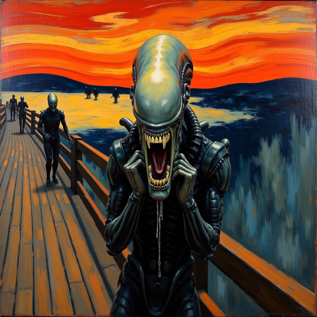 Imagine a highly detailed reinterpretation of Edvard Munch's The Scream, recreated in the original expressive painting style, but with a Xenomorph as the central figure. The creature stands on the iconic bridge, its elongated skull tilted upward, ridges catching the swirling, vibrant colors of the fiery orange and red sky. Its clawed hands clutch its sleek, eyeless head, mimicking the haunting pose of the original figure. Thick strands of acidic drool stretch from its open maw, blending into the chaotic brushstrokes of the background. The bridge’s wooden planks are warped and uneven, amplifying the surreal atmosphere, while the dark figures in the distance are barely visible through the turbulence of Munch’s trademark style. The Xenomorph’s sleek, biomechanical texture contrasts eerily with the organic chaos of the painted surroundings, creating a perfect fusion of terror and artistry.