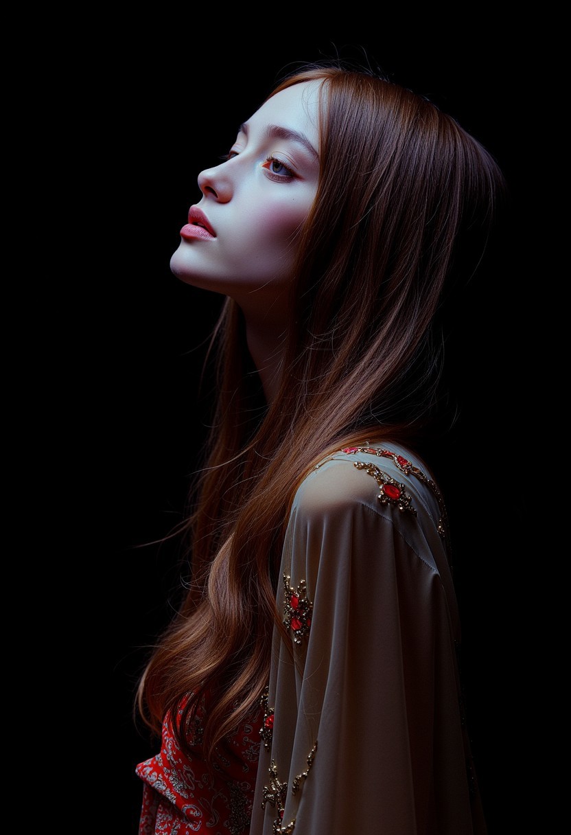 A professional (fashion photo photography:1.2),a (studio portrait:1.2),showing (surrealistic style:1.1),(black purple gradient background:1.2),(exaggerated character movements:1.5),against glass,(masterpiece, best quality:1.4), perfect body, long hair, brown hair, brown eyes, parted lips, , detailed skin,model photoshoot, long bob-cut hair, shiny oiled skin, pale skin, pale white skin, shiny oiled skin, pale skin, realistic eye and face details), hyperrealism, very slim, 4k HDRvaporwave style Ultra High Resolution, wallpaper, 8K,Rich texture details, hyper detailed, detailed eyes, detailed background, dramatic angle,Ultra High Resolution, wallpaper, 8K,Rich texture details, hyper detailed, detailed eyes, detailed background, wearing translucent veils, elegant profile pose, dark photography, dramatic lighting, black background, deep shadows, chiaroscuro, (old russian folk light dress red ornaments:1.1) slim elegant russian girl folk hairstyle halo above head (icon style:1.2) choker, make-up photography by (Ethel Warwick:1.3), modelshoot, pose, , (Ethel Warwick: 1,2) award winning photo macro shot dramatic lighting,philosophical dimensions,NIKON Z9,35mm,f/1.2,RAW format,stark composition.,(muted tones:1.2),award winning photo,(dream-like quality:1.2),