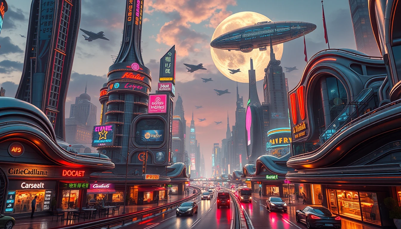 A ultra realitic photo of a futuristic city at the year 2450, flying cars, organic architcture, stores and restaurants with colorful neon signs, futuristic flying streamlined cars, warm evening light from a massive supermoon sparkles the glossy buildings, hoovering luminiscent airships in the sky