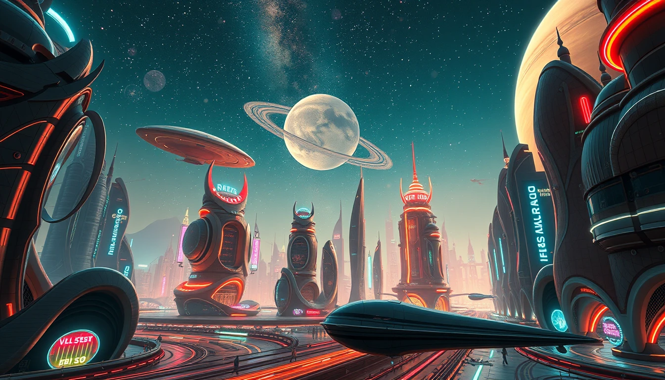 A ultra realitic photo of a futuristic city, organic architcture, colorful neon light, futuristic flying streamlined cars, in the sky a visible milkyway, warm light from a massive planet with rings like saturn sparkles the glossy buildings, hoovering luminiscent airships crossing the sky