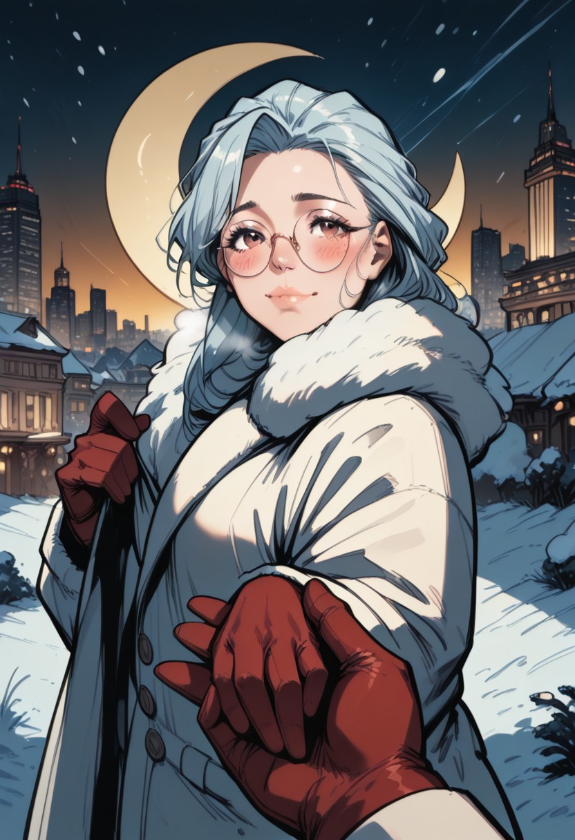 commix style, zPDXL3, PnyCmicXLPOS, score_9, score_8_up, score_7_up, masterpiece, best quality, absurdres, vibrant, highly detailed, very aesthetic, solo focus, pov hands, out of frame, from side, mature, stunning, 1girl, solo, saihoutakenoue, long hair, black fluffy scarf, long white winter coat, red gloves, fluffy gloves, glasses, standing, (cold, flushed cheeks, red nose, breathing effects:1.2), happy, looking at viewer, holding hands, leading, outdoors, night, snowing, Paris, Eiffel Tower, Champ-de-Mars, city lights, (crescent moon:1.4)
