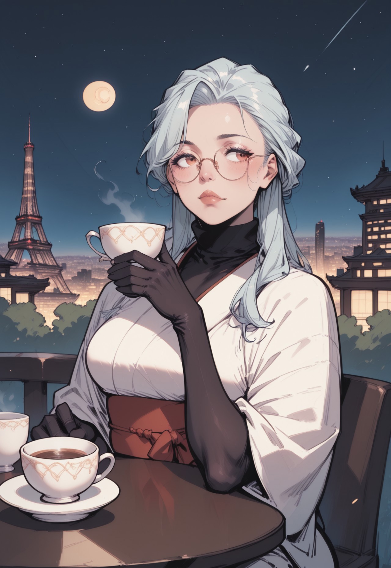 commix style, zPDXL3, PnyCmicXLPOS, score_9, score_8_up, score_7_up, masterpiece, best quality, absurdres, vibrant, highly detailed, very aesthetic, from side, cowboy shot, mature, stunning, 1girl, solo, saihoutakenoue, white kimono, black turtleneck, black gloves, elbow gloves, red obi, glasses, sitting, plucked lips, steaming tea cup, holding tea cup, one hand on cup, one arm on table, cafe terrace, table, outdoors, night, Paris, Eiffel Tower, Champ-de-Mars, city lights, starry sky, (crescent moon:1.4)