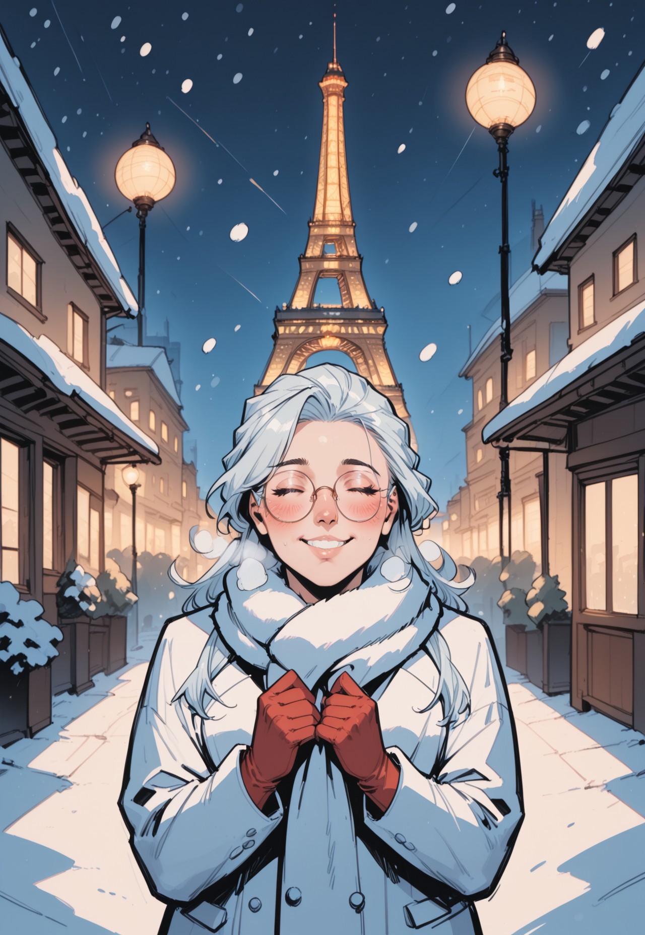 commix style, zPDXL3, PnyCmicXLPOS, score_9, score_8_up, score_7_up, masterpiece, best quality, absurdres, vibrant, highly detailed, very aesthetic, full front, from below, mature, stunning, 1girl, solo, saihoutakenoue, long hair, black fluffy scarf, long white winter coat, red gloves, fluffy gloves, glasses, standing, (cold, flushed cheeks, red nose, breathing effects:1.2), closed eyes, smile, teeth, hands on scarf, adjusting scarf, outdoors, night, winter, ruanyi0732, snowing, Paris, Eiffel Tower, Champ-de-Mars, city lights, crescent moon