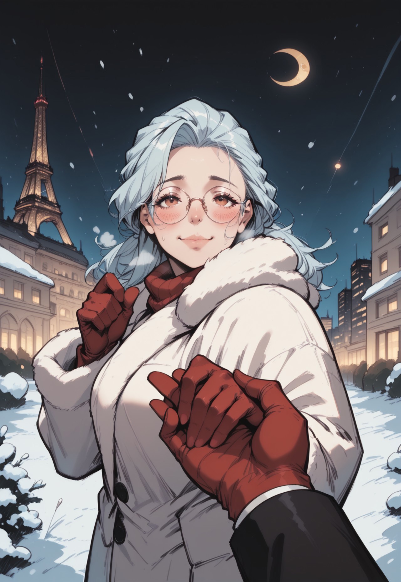 commix style, zPDXL3, PnyCmicXLPOS, score_9, score_8_up, score_7_up, masterpiece, best quality, absurdres, vibrant, highly detailed, very aesthetic, solo focus, pov hands, out of frame, from side, mature, stunning, 1girl, solo, saihoutakenoue, fluffy scarf, long white winter coat, red gloves, fluffy gloves, glasses, standing, (cold, flushed cheeks, red nose, breathing effects:1.2), happy, looking at viewer, holding hands, leading, outdoors, night, snowing, Paris, Eiffel Tower, Champ-de-Mars, city lights, (crescent moon:1.4)