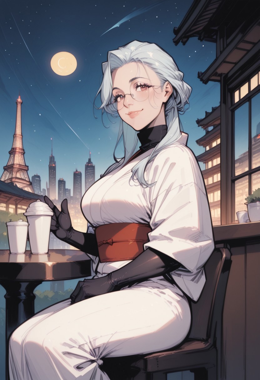 commix style, zPDXL3, PnyCmicXLPOS, score_9, score_8_up, score_7_up, masterpiece, best quality, absurdres, vibrant, highly detailed, very aesthetic, from side, cowboy shot, mature, stunning, 1girl, solo, saihoutakenoue, white kimono, black turtleneck, black gloves, elbow gloves, red obi, glasses, sitting, waving at viewer, smile, cafe terrace, table, steaming cup, looking at viewer, outdoors, night, Paris, Eiffel Tower, Champ-de-Mars, city lights, starry sky, (crescent moon:1.4)