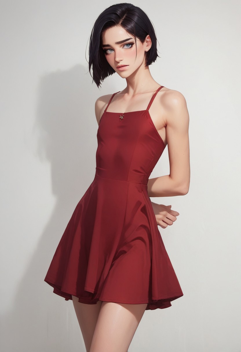 score_9, score_8_up, score_7_up, 1boy, femboy, otoko no ko, short hair, bob cut hair, black hair, grey eyes, gray eyes, feminine face, toned body, Shelly, summerdress, red dress, highly detailed, intricate, zzCitronCAT, standing, contrapposto, arms behind back, shy expression, cowboy shot, modelshoot, abstract background, solo