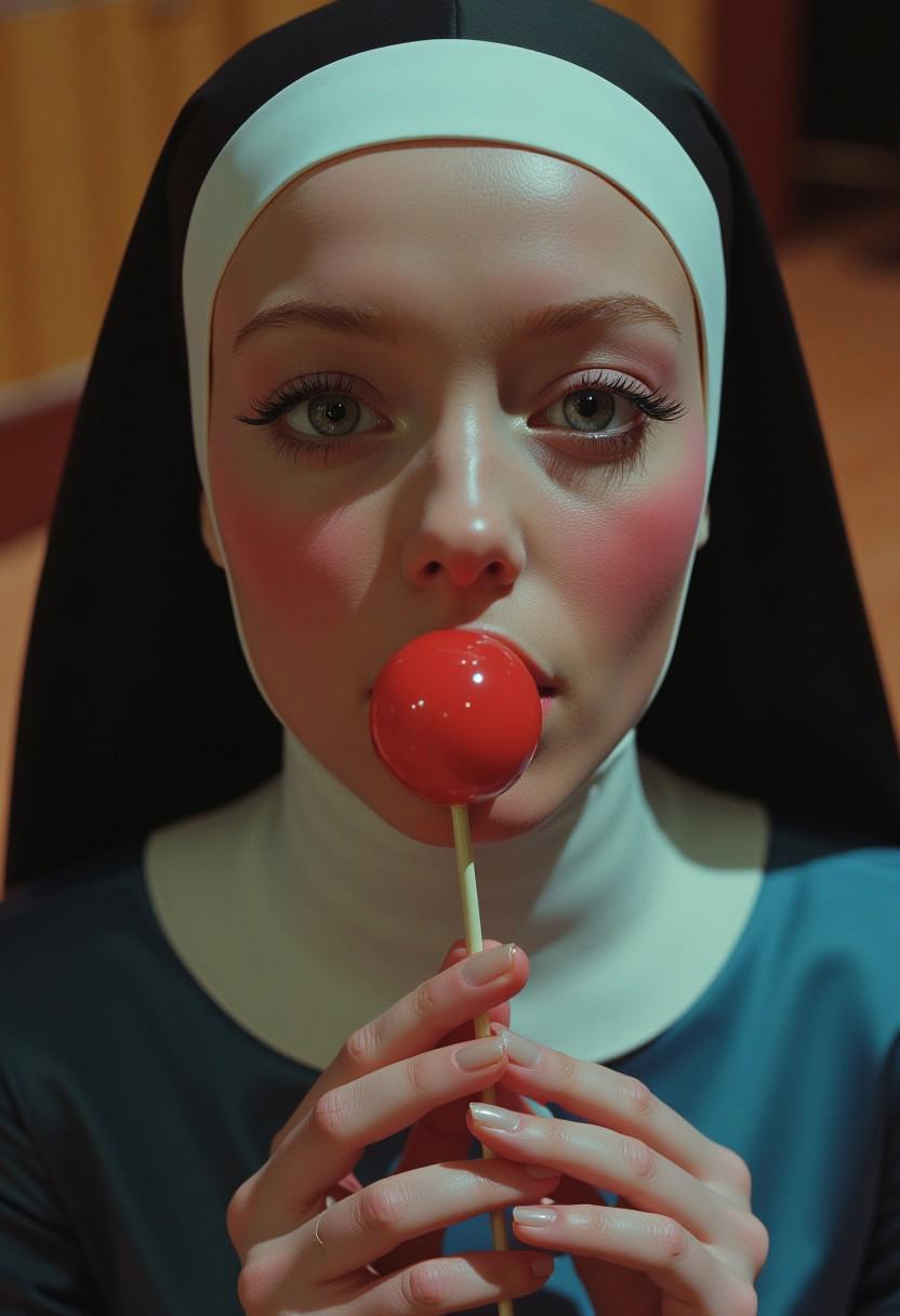 A surreal dreamy low saturation, soft focus, exaggerated high angle shot with a vintage aesthetic of a woman in a nun's habit licking a cherry lollipop.