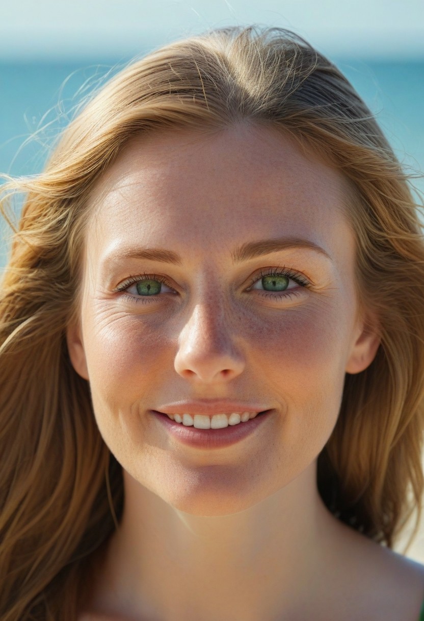 "A hyper-realistic, artistic half-body portrait of a breathtaking 45-year-old Nordic woman with light brown hair and deep green eyes. Her sun-warmed skin is flawless, with a golden hue and no freckles, while subtle lines tell a story of laughter and experience. Her medium-length hair, kissed by the ocean breeze, moves gently. The lighting is delicately diffused, creating soft highlights on her cheekbones and a warm glow on her skin. Her expression is contemplative yet confident, her eyes gazing slightly past the lens. The background, softly blurred, features a tranquil beach and the sparkling blue sea. Captured with a Nikon D5300, 50mm lens, f/1.8, ISO 100, ensuring every facial texture is perfectly rendered."