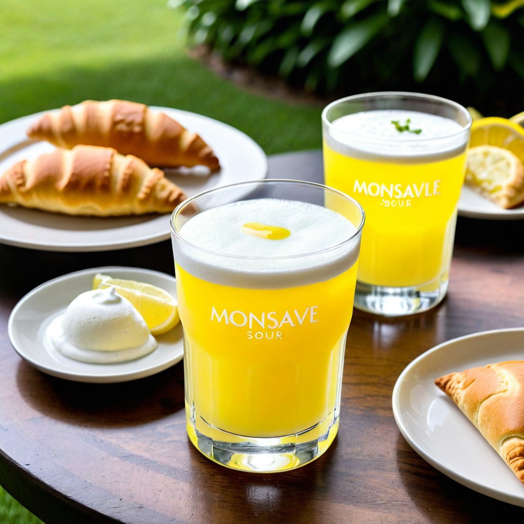 "I need a single 5oz Personalized Double Old Fashioned glass, wide at the top and very tapered at the base, holding a yellow Pisco Sour made with lemon. The drink has a thin white foam topping and features translucent white text outside the glass that reads 'Monsalve.' The glass is placed on a table with a dish of empanadas, set against a beautiful lawn with tables and canopies in the background.",No Pool, only Lawn