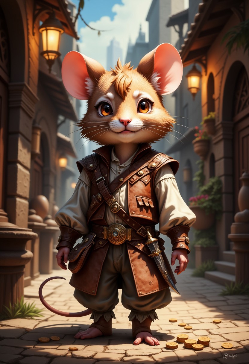 A detailed digital painting of an anthropomorphic mouse character in an anime style. The character has a humanoid body and the face of a clever mouse, with soft, velvety fur and a pair of prominent ears that twitch with life. Its inquisitive golden eyes, glinting with mischief, dominate the composition, drawing the viewer into the mouse’s cunning and adventurous persona. The mouse wears a patched leather jerkin over a simple linen shirt, complemented by a braided belt from which dangles a tiny dagger and a pouch of coins. The background depicts a medieval cobblestone street illuminated by flickering lanterns, with shadows dancing across the walls of a bustling marketplace. A subtle trail of breadcrumbs lies at the mouse’s feet, hinting at a secretive plot. The painting blends warm, inviting tones with intricate details of fur, leather, and cloth, capturing the resourcefulness of this diminutive adventurer.