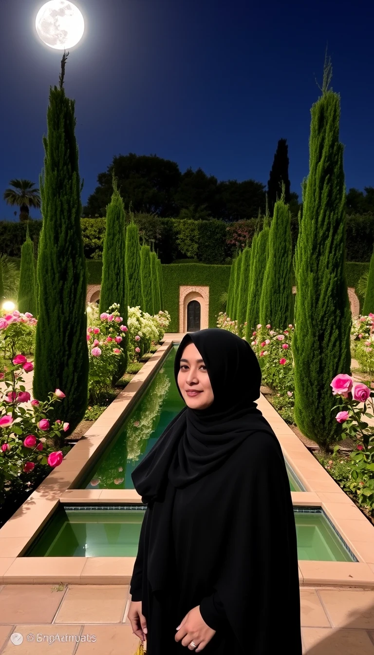 The woman stands in the Eram Garden of Shiraz, surrounded by blooming roses, cypress trees, and a reflecting pool. The moonlight illuminates the garden’s vibrant colors, and her black hijab contrasts beautifully with the lush greenery. The air is filled with the scent of roses, and the sound of a distant tar playing adds to the poetic atmosphere.