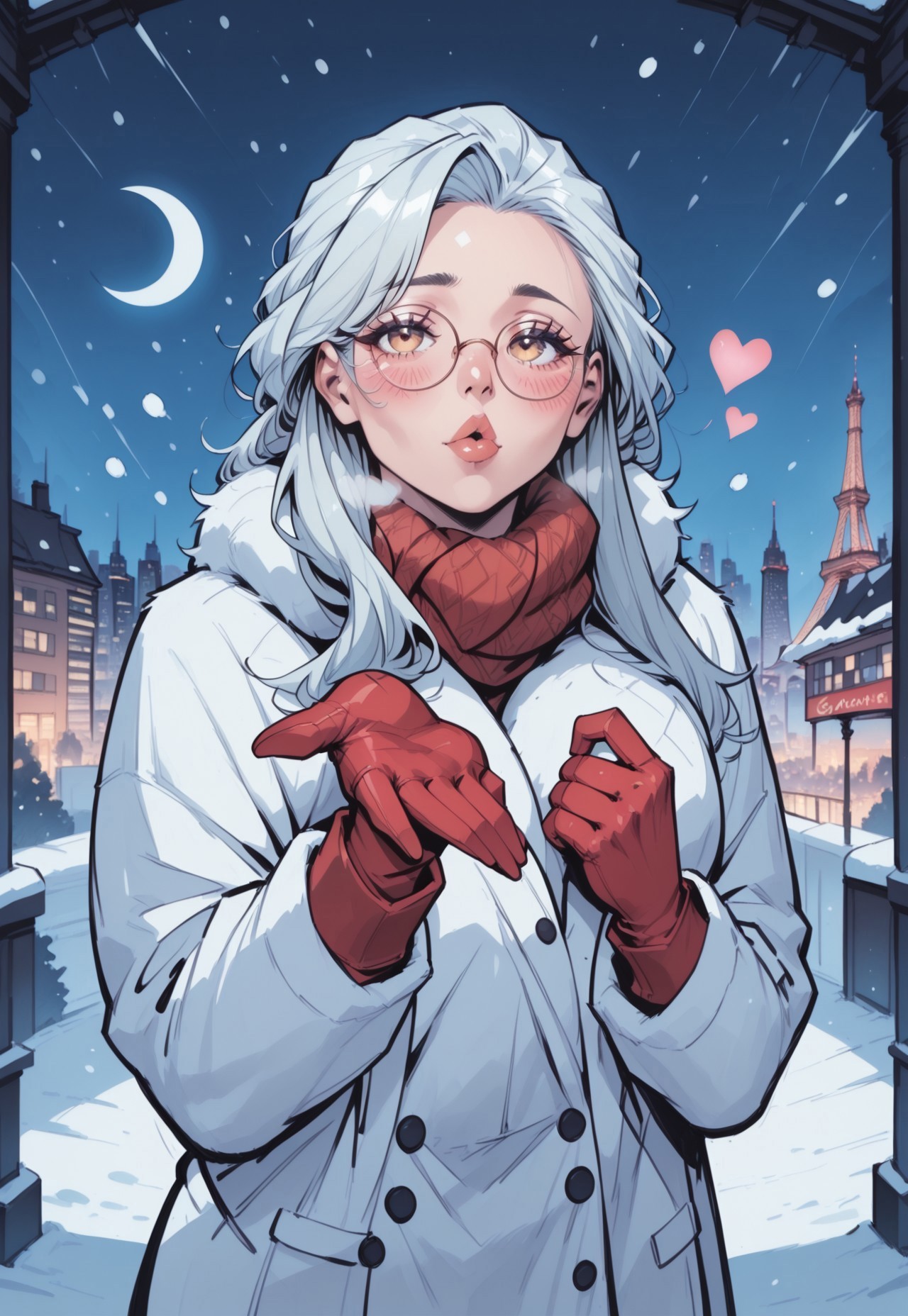 commix style, zPDXL3, PnyCmicXLPOS, score_9, score_8_up, score_7_up, masterpiece, best quality, absurdres, vibrant, highly detailed, very aesthetic, mature, stunning, 1girl, solo, saihoutakenoue, long hair, fluffy scarf, long white winter coat, red gloves, glasses, standing, flushed cheeks, red nose, breathing effects, (plucked lips:1.2), (blowing kiss, heart), looking at viewer, (leaning forward:0.6), outdoors, night, snowing, (Paris, Eiffel Tower), city lights, crescent moon