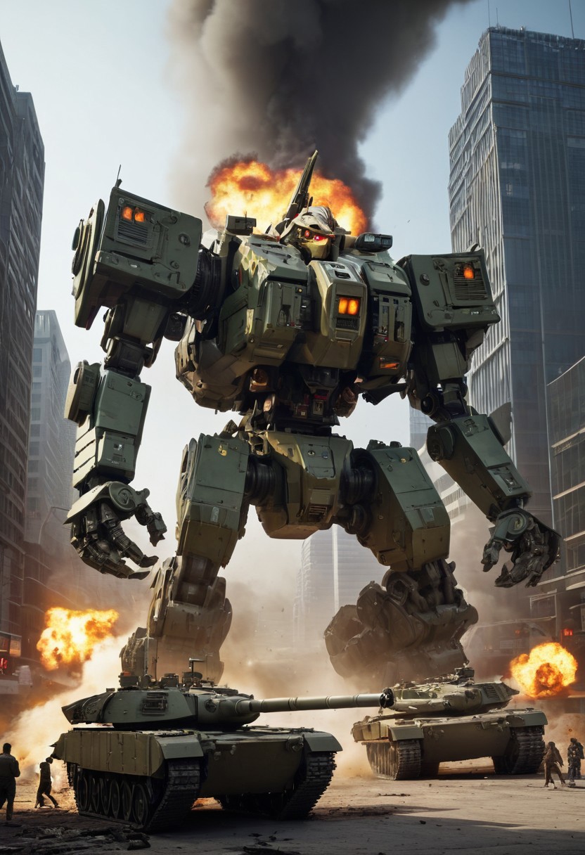 masterpiece, best quality, amazing quality, intricate details, solo, mecha, giant robot, chicken, size difference, city, military, military vehicles, tank, aircraft, battle, explosion,