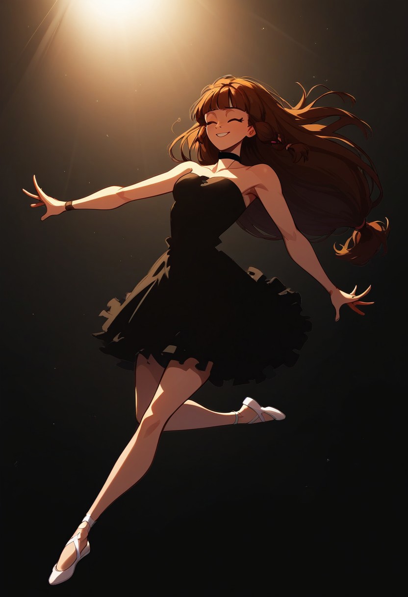 Blend_in, black background, score_9, score_8_up, score_7_up, masterpiece, best quality, absurdres, highly detailed, (high contrast, spotlight), (from above:0.6), flying dust particles,mature, stunning, BREAK 1girl, solo, imtdlilaross, long hair, low-tied long hair, green eyes, blunt bangs, brown hair, hair tubes, thin black choker, strapless ballerina attire, bell tutu, pitch black clothes, (white ballerina pointes), arabesque, dynamic pose, open legs, stage performance, smile, closed eyes