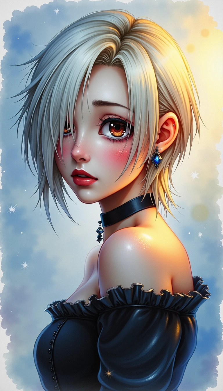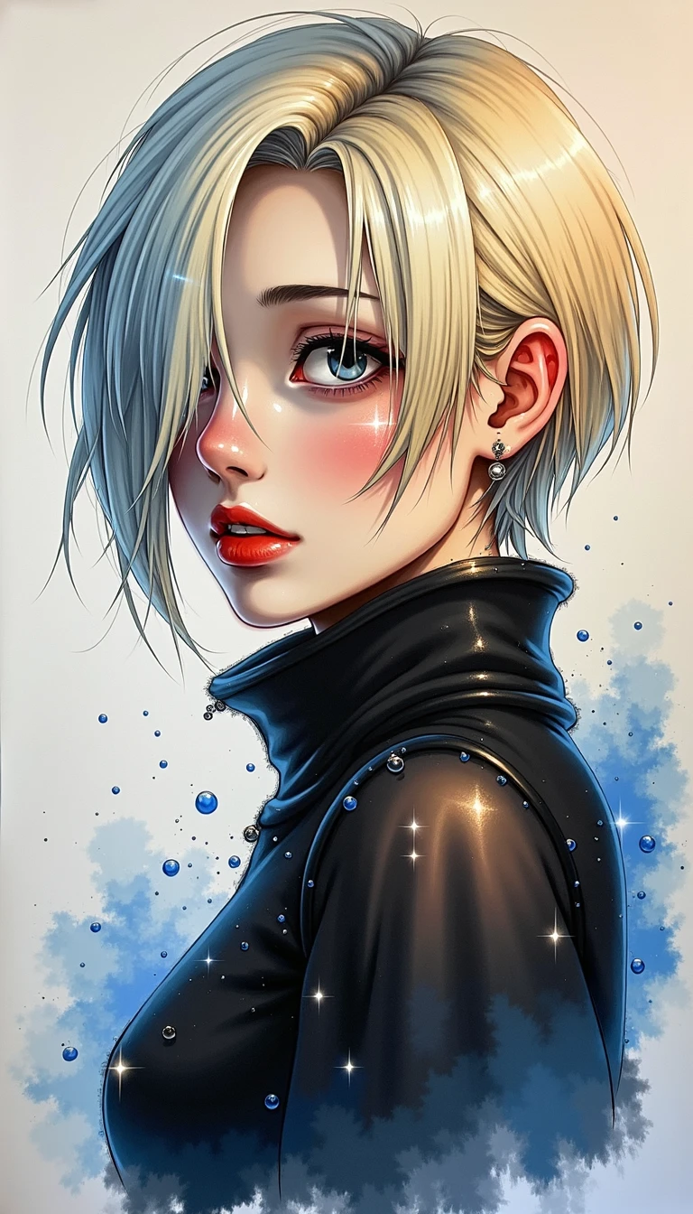 A mesmerizing charcoal sketch captures the essence of a young, exquisite woman with loose, platinum hair, ice, ice elemental, her enchanting gaze draws the viewer in, as the artist masterfully blends light blue, yellow, and red hues to create a captivating and celestial ambiance. The soft color palette highlights the subject's grace and elegance, showcasing the artist's exceptional skill in capturing the essence of beauty through their brushstrokes. Oil painting, Ren Caverly, wearing black,