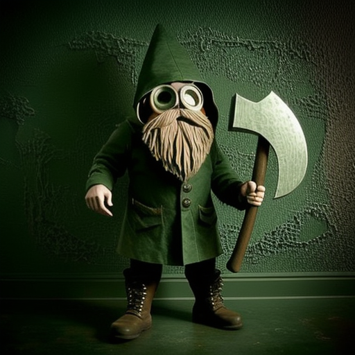 ArsMJStyle, Artisan Oddities Fantasy, The image shows a person dressed up as a gnome standing in front of a green wall. The gnome is wearing a green coat a pointed hat and a pair of goggles. It has a long beard and mustache and is holding an axe in its right hand. The person is also wearing brown boots and has a mischievous expression on their face. The overall mood of the image is playful and whimsical., solo, 1boy, goggles, male focus, boots, axe, hat, weapon, coat, blonde hair