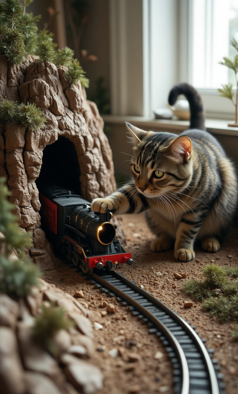 A playful cat interacts with a miniature train set in a realistic scene. The tiny train track winds through a detailed landscape, including a small, dark tunnel carved into a rocky mountain. The cat, a curious tabby with bright green eyes, playfully bats at the train as it emerges from the tunnel, causing slight movement in its tail and whiskers. The scene is lit by soft, natural daylight streaming through a nearby window, highlighting the textures of the train set and the cat's fur. The dynamic composition captures the moment of playful energy.